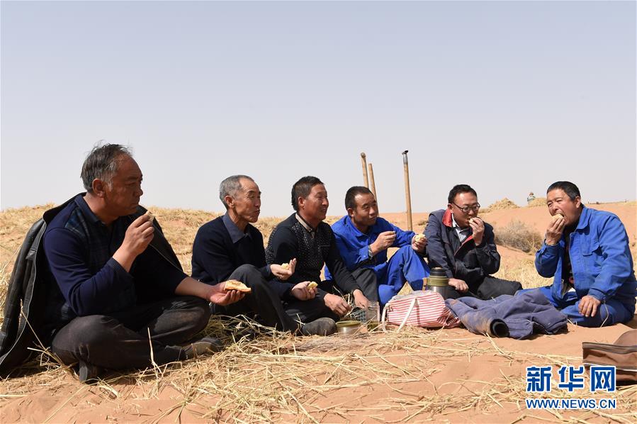 在甘肅省古浪縣境內(nèi)的黑崗沙風(fēng)沙口,八步沙第二代治沙人賀中強(qiáng)(左一)、郭萬(wàn)剛(左二)、石銀山(左三)、羅興全(右三)、程生學(xué)(右二)、王志鵬(右一)在休息間隙吃午飯(3月26日攝)。二十世紀(jì)八十年代,八步沙是騰格里沙漠南緣甘肅省古浪縣最大的風(fēng)沙口。當(dāng)?shù)亓荒挲g加在一起近300歲的老漢,在承包沙漠的合同書上按下手印,誓用白發(fā)換綠洲。38年過去,六老漢只剩兩位在世。