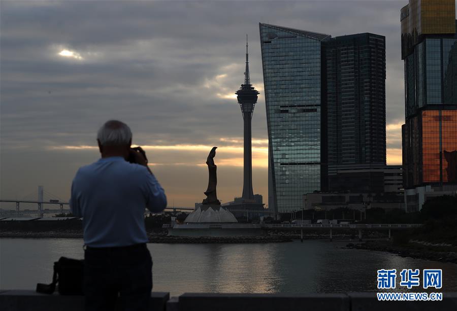落日時(shí)分,一名男子在澳門海邊拍攝照片(12月17日拍攝)。新華社記者李鋼攝