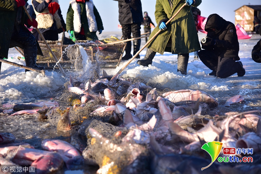 2018年12月26日,吉林松原,查干湖迎來了“紅網”,單網捕撈約30萬斤。