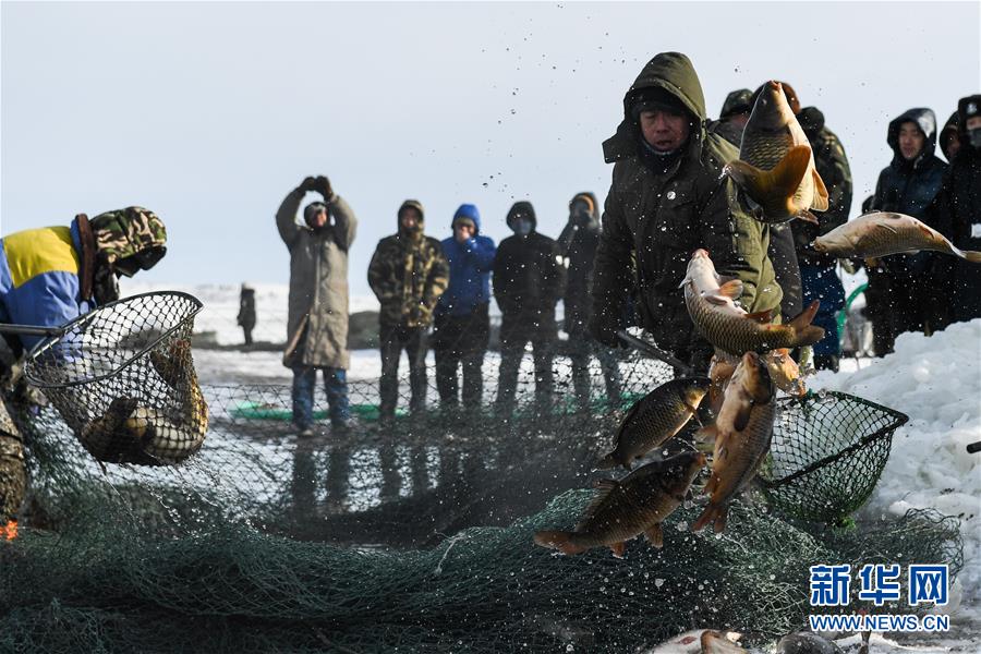 12月18日,工作人員將冬捕魚打撈上岸。當(dāng)日,位于內(nèi)蒙古呼倫貝爾大草原上的諾干湖舉行冬捕活動(dòng),吸引不少游客前來觀看。冬日的諾干湖冰雪覆蓋,諾干湖冬捕也是當(dāng)?shù)囟韭糜蔚奶厣顒?dòng)之一。新華社記者劉磊攝