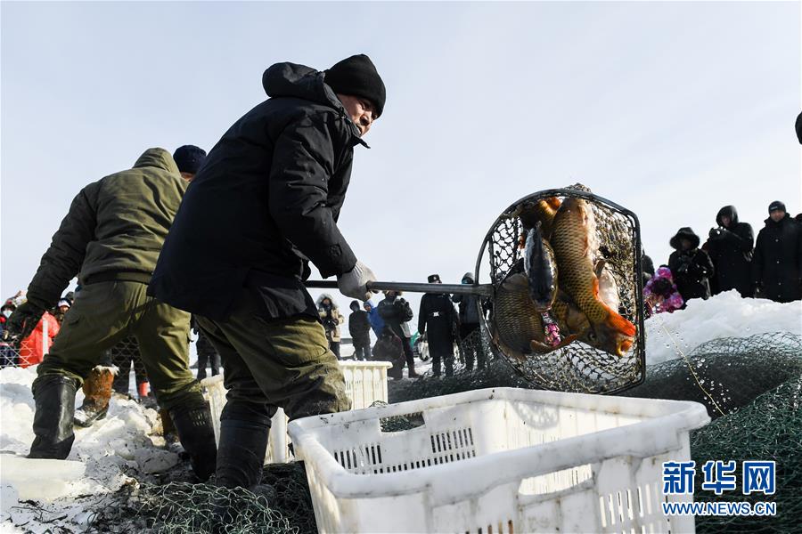 12月18日,一名工作人員將捕撈上來(lái)的魚放入筐中。新華社記者劉磊攝