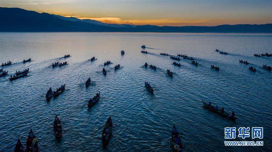 12月25日,漁船駛?cè)胄窃坪o人機拍攝)。當日,位于云南省玉溪市江川區(qū)的星云湖迎來一年一度的開湖捕魚季,600余艘漁船駛?cè)胄窃坪稉啤P窃坪窃颇鲜【糯蟾咴粗?,本次開湖捕魚時間將從2019年12月25日持續(xù)至2020年1月23日。新華社記者胡超攝
