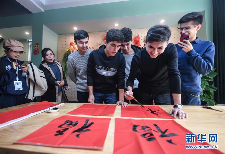 12月27日,外國(guó)留學(xué)生在瓜山新苑社區(qū)活動(dòng)中心參加迎新年活動(dòng),學(xué)習(xí)用毛筆寫(xiě)福字。新華社記者 徐昱 攝