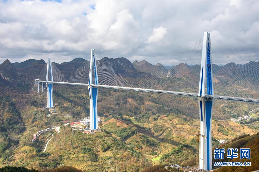 2019年1月7日無人機(jī)航拍的平塘特大橋橋塔全景,中為高332米的世界第一高混凝土橋塔。新華社記者歐東衢攝