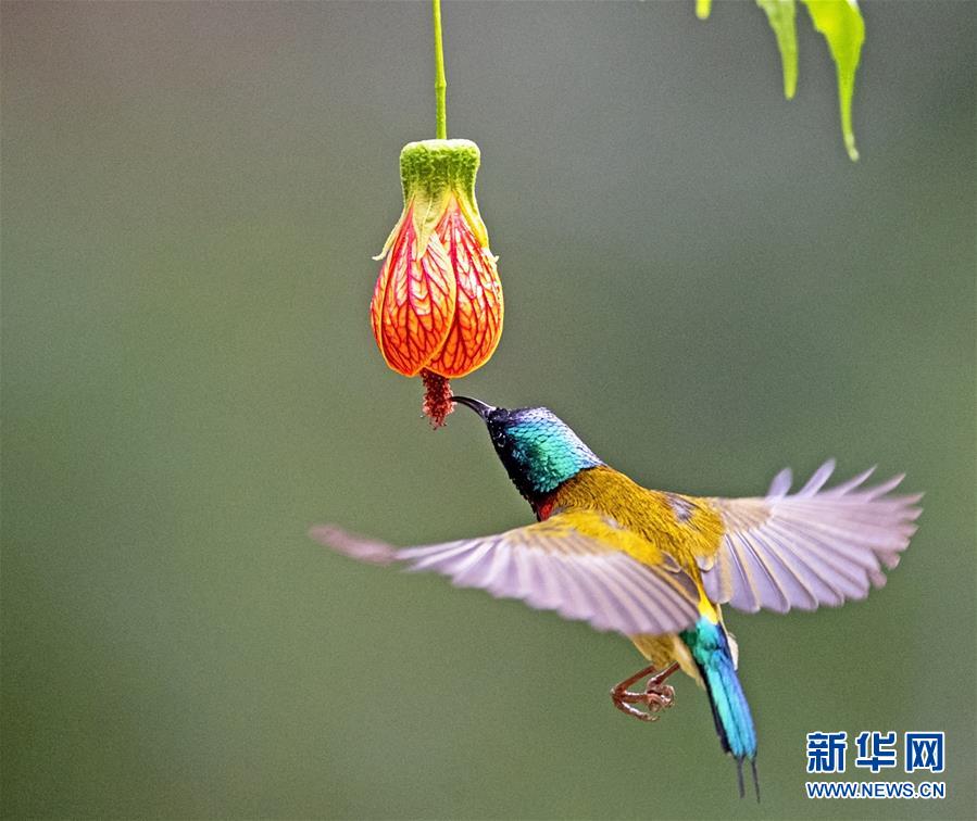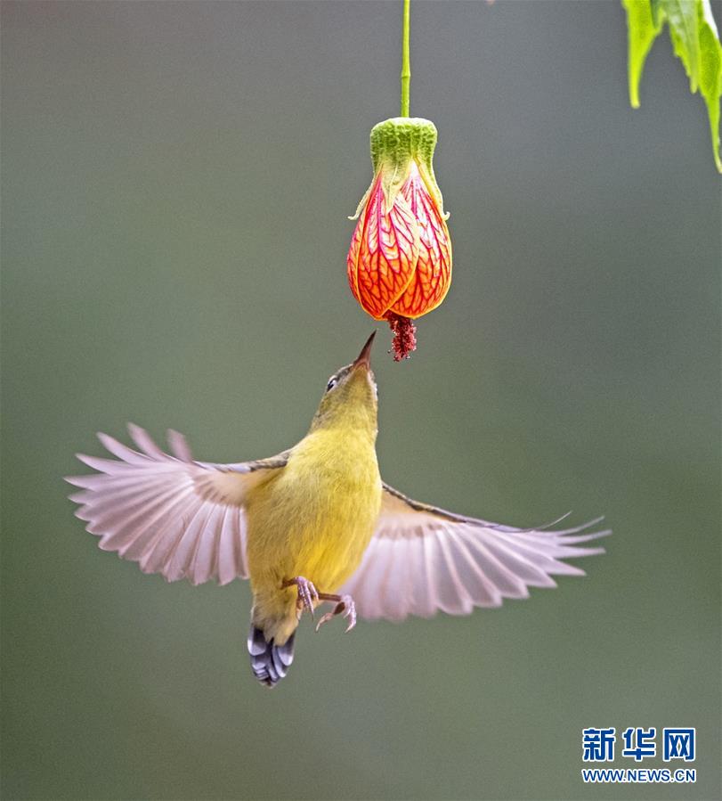 在福州市西湖公園,一只叉尾太陽鳥在狀如燈籠的懸鈴花前懸停、采蜜(1月3日攝)。 叉尾太陽鳥嬌艷靚麗,懸鈴花造型優(yōu)美,花與鳥相映成趣,成為冬季榕城一道美麗的風景。叉尾太陽鳥又叫“亞洲蜂鳥”,是福州的“明星鳥”。 新華社記者梅永存攝