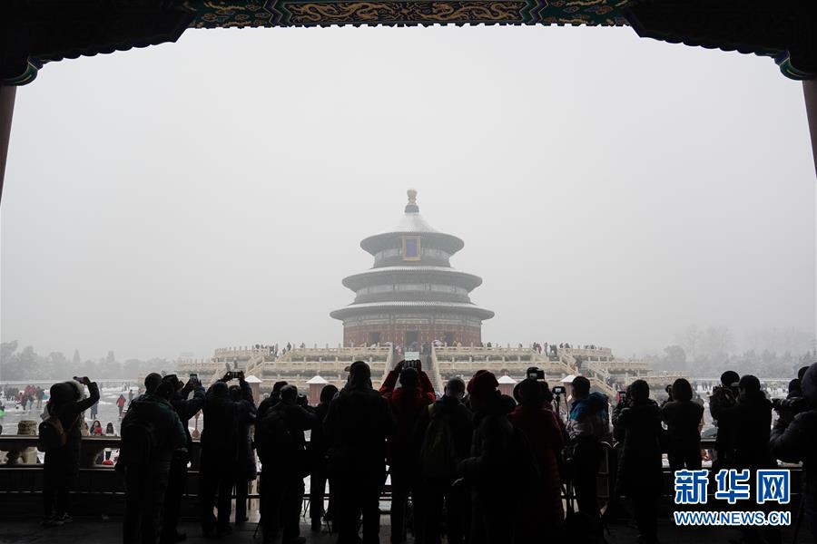 12月16日,人們?cè)谔靿珗@觀賞雪景。當(dāng)日,北京迎來降雪天氣。新華社記者鞠煥宗攝