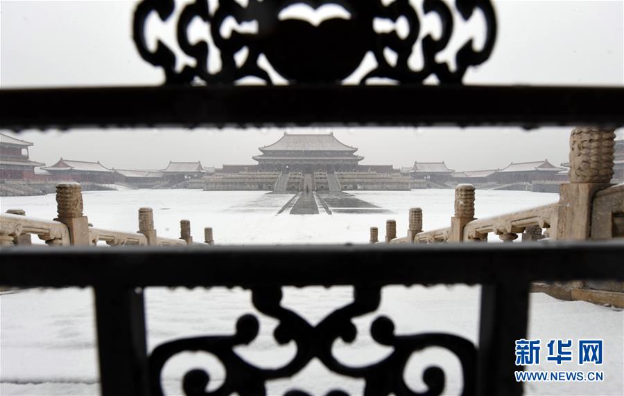 12月16日拍攝的雪中的故宮太和殿廣場。當(dāng)日,北京迎來降雪天氣。新華社記者金良快攝