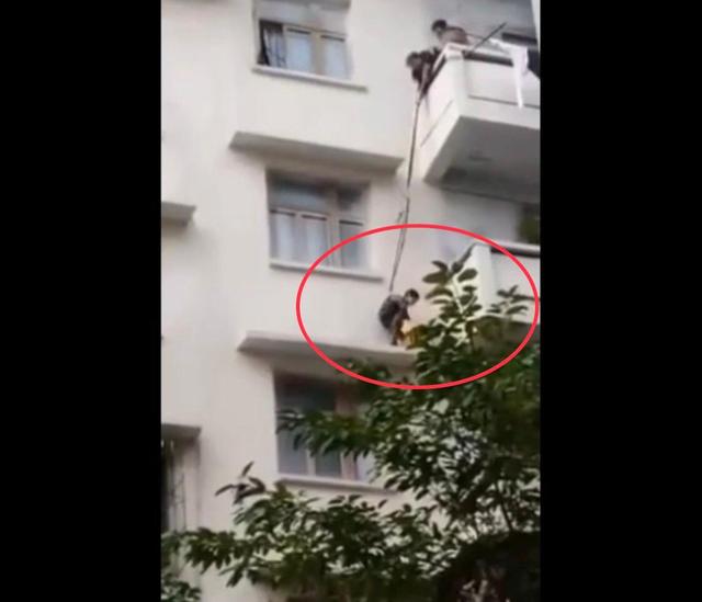 小男孩被大人們用繩子系著腰,晃晃悠悠地吊下三樓遮雨平臺后,勇敢地走向貓,將其抱起,接著又被5樓的奶奶等人晃晃悠悠地吊起往上拉,小男孩全程表情木然,絲毫未見緊張害怕。萬幸的是,最終男孩平安并順利完成任務(wù)。