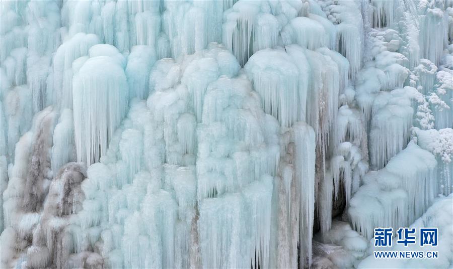 這是1月7日拍攝的賀蘭山巖畫景區(qū)內(nèi)的冰瀑景觀(無人機(jī)照片)。近日,寧夏賀蘭山巖畫景區(qū)內(nèi),自然山泉凍結(jié)冰瀑和人造冰瀑景觀相結(jié)合,形成多處冰瀑景觀,山間形態(tài)各異的冰掛、冰柱鬼斧神工,蔚為壯觀,吸引眾多游客前來觀賞。  新華社記者 王鵬 攝