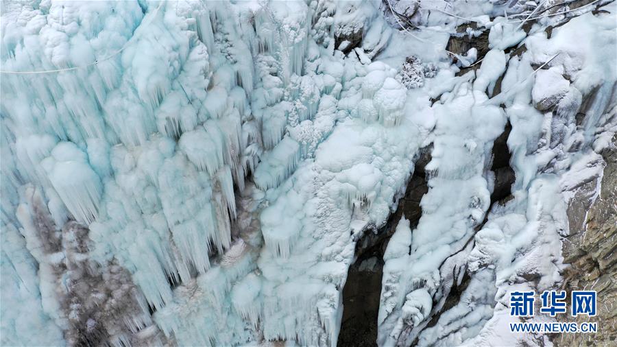 這是1月7日拍攝的賀蘭山巖畫景區(qū)內(nèi)的冰瀑景觀(無(wú)人機(jī)照片)。 新華社記者 王鵬 攝