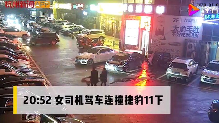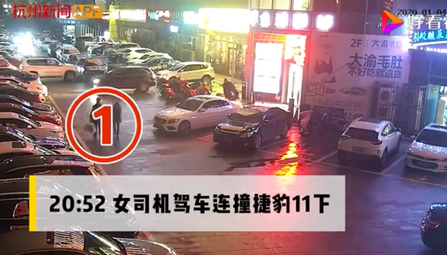 通過監(jiān)控發(fā)現(xiàn),捷豹車當(dāng)時并沒有停在停車位上,而是橫著停在停車位前的通道上,正好擋住了停在停車位里面的車輛。晚上8點40左右,一輛白色豐田普拉多越野車被捷豹擋住無法出去,10多分鐘后,司機通過倒車再加速十幾次撞擊捷豹,最終把車輛撞開后駛離現(xiàn)場。