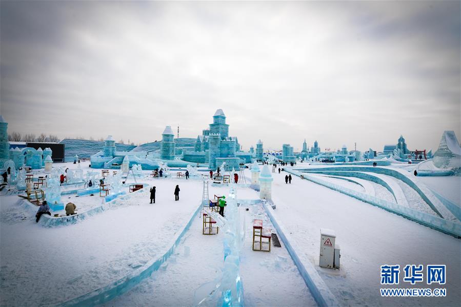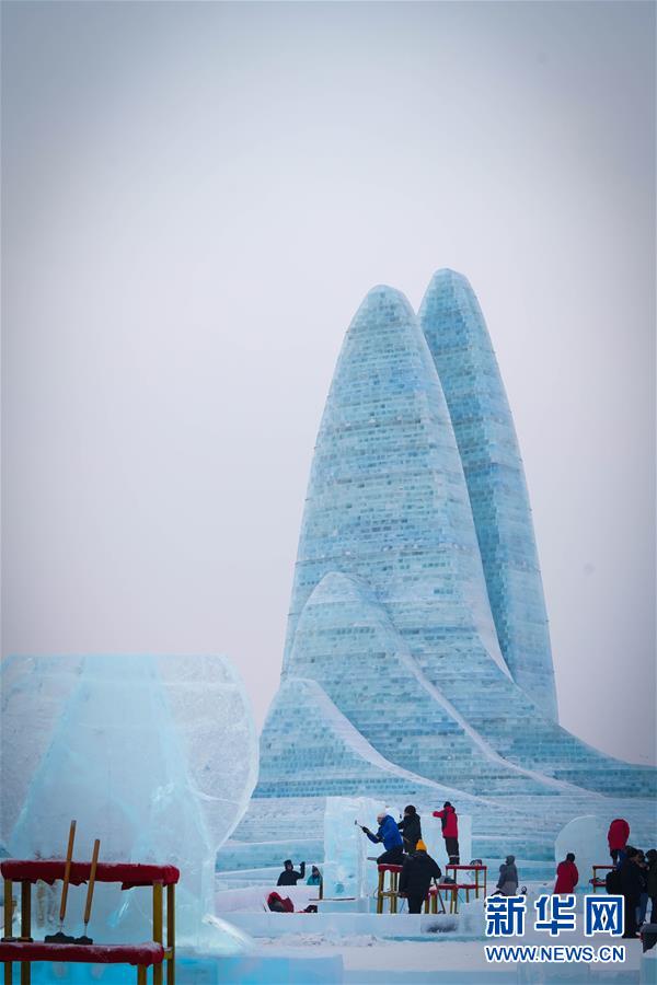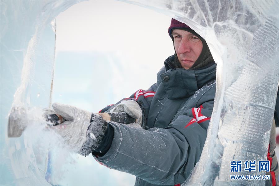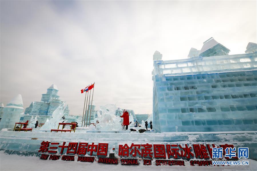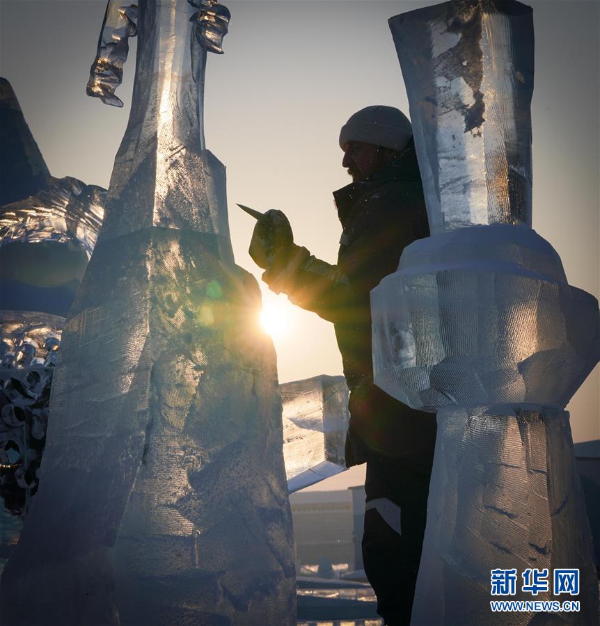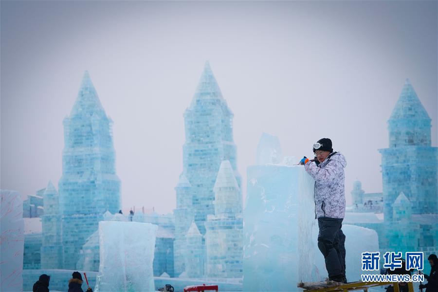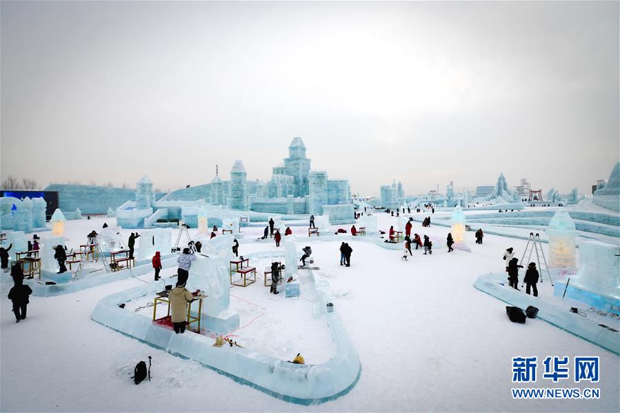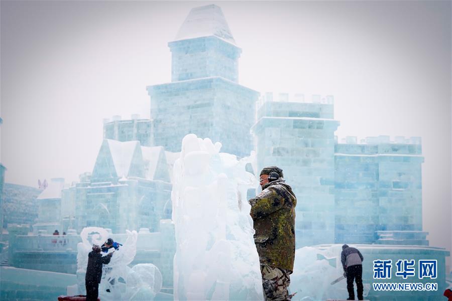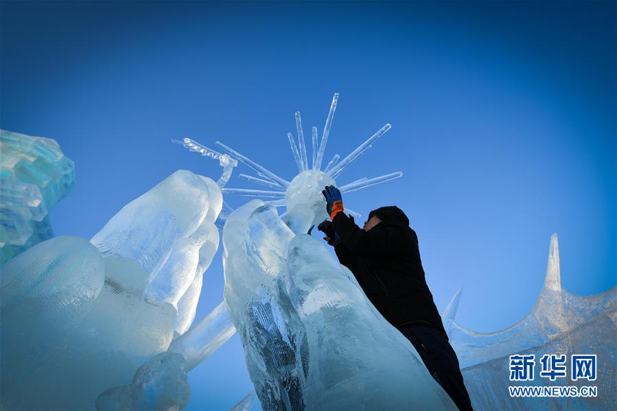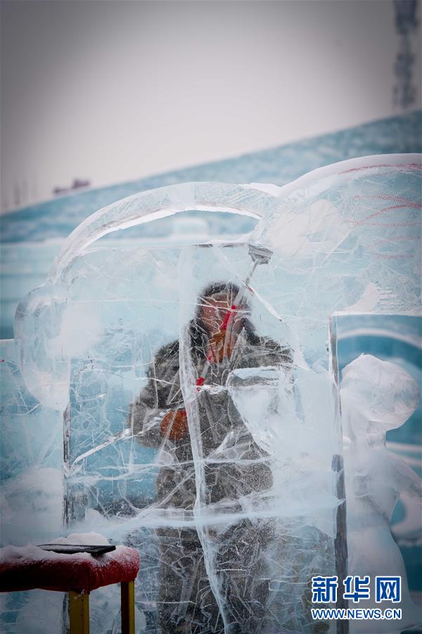 第九屆中國·哈爾濱國際組合冰雕比賽選手在哈爾濱冰雪大世界內(nèi)制作冰雕(1月2日攝)。新華社記者王松攝