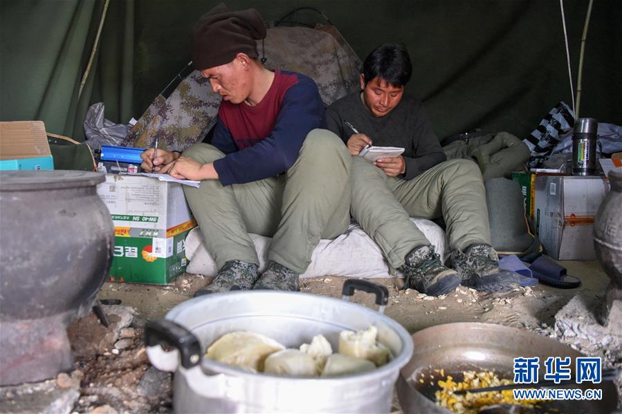 1月14日,查線工在吃飯間隙收聽電臺(tái)里報(bào)出的不正常道樁號(hào),并記錄在本子上。地球物理勘探是油氣開發(fā)的第一步,相當(dāng)于給地球做CT。物探工人按照嚴(yán)格的測(cè)線部署,在相應(yīng)位置鉆井,然后實(shí)施地震,采集地震波數(shù)據(jù)。科研人員通過數(shù)據(jù)組成的“CT片”,就能夠清晰地“看”到地下的地質(zhì)結(jié)構(gòu),判斷哪里埋藏有石油或者天然氣。2019年10月,東方地球物理勘探有限責(zé)任公司塔里木物探處2113隊(duì)進(jìn)入新疆塔克拉瑪干沙漠腹地,開始中古14-21、塔中2兩個(gè)區(qū)塊的三維地震勘探。近2000名物探工人將在1000平方公里的范圍內(nèi)一直工作到2020年4月,這也意味著他們將在塔克拉瑪干沙漠腹地連續(xù)度過第14個(gè)除夕夜。蘊(yùn)藏著豐富石油天然氣資源的新疆塔克拉瑪干沙漠有“死亡之?!敝Q,氣候干燥,年降水量在50毫米以下,冬季地表最低溫度超過零下30攝氏度,是世界油氣勘探難度最大的地區(qū)之一。為避開風(fēng)季,物探工人每年9、10月份進(jìn)入沙漠,一直工作到來年4月,夜以繼日與黃沙、嚴(yán)寒為伴,用辛勤的汗水,為祖國(guó)找油找氣。新華社記者丁磊攝