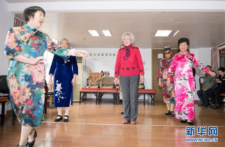1月17日,王育華(前)帶著模特隊(duì)的隊(duì)員在杭州市社會(huì)福利中心音樂教室唱《茉莉花》。