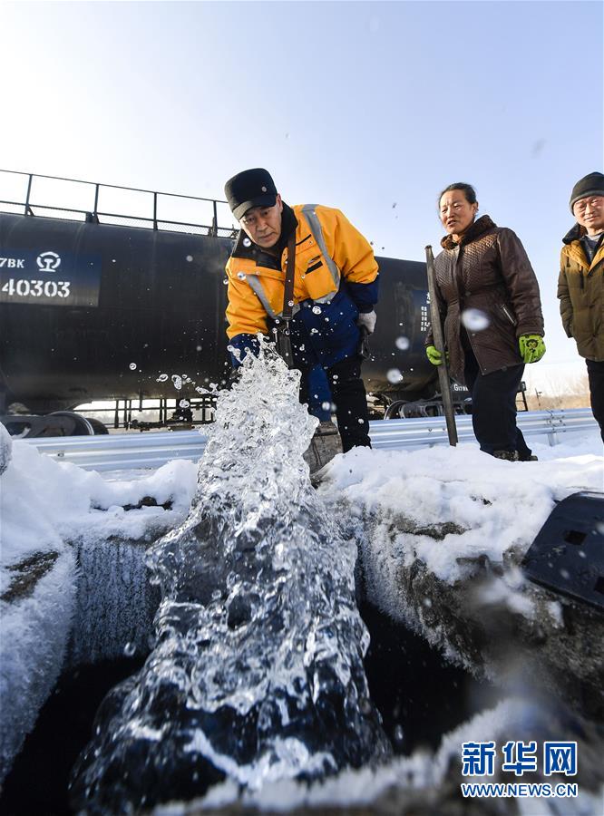 因?yàn)槎緶囟冗^(guò)低,送水員黃衛(wèi)東在蓄水前需要提前加熱閥門(1月17日攝)。新華社記者 許暢 攝