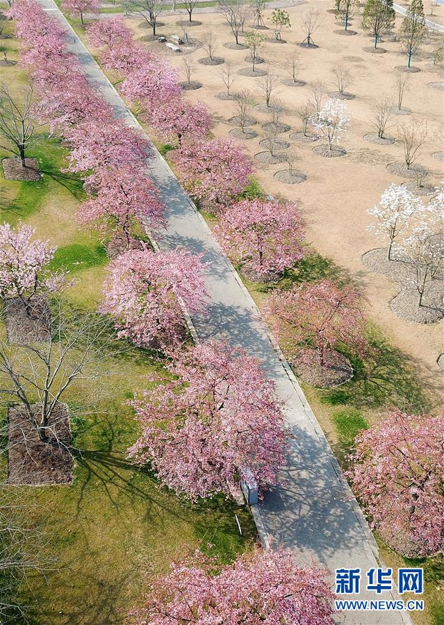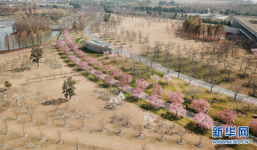 這是2月24日在上海松江辰山植物園內(nèi)拍攝的櫻花小徑(無人機(jī)照片)。  新華社記者 方喆 攝
