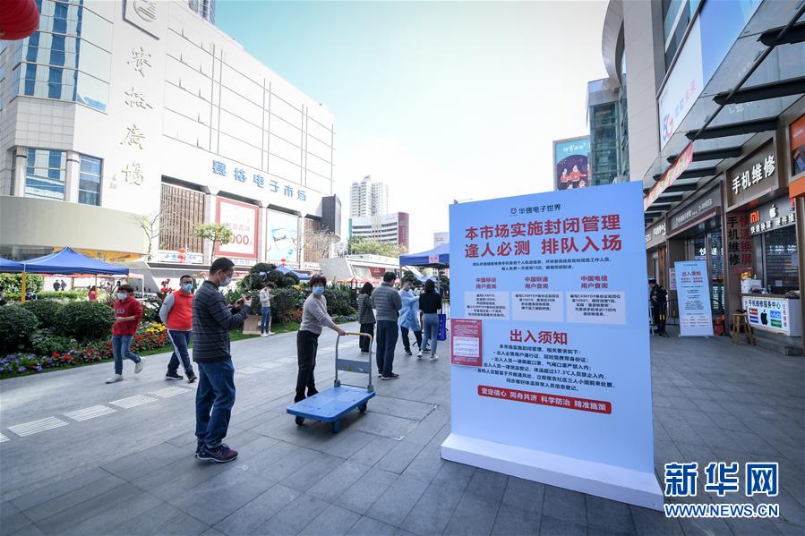 2月24日,在深圳華強北的華強電子世界門外,商戶排隊等待進入市場。 新華社記者 毛思倩 攝