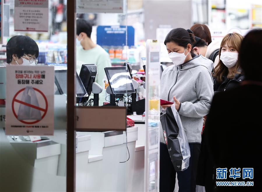 2月24日,在韓國(guó)首爾,當(dāng)?shù)鼐用裨邶埳絽^(qū)一家日用品商店排隊(duì)結(jié)賬。 新華社記者 王婧嬙 攝