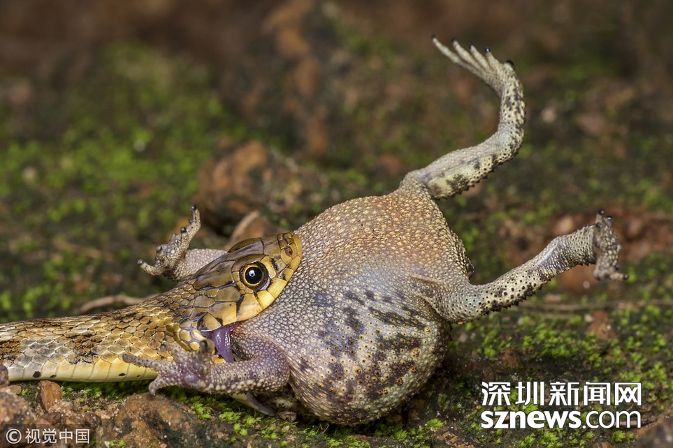 印度加爾各答B(yǎng)olpar,業(yè)余攝影師Agniswar Ghosal在Bolpar散步時拍到蛇大口吞咽蟾蜍的震撼場景。一條細(xì)長的蛇正試圖整個吞下一只大蟾蜍,蟾蜍的頭已經(jīng)進(jìn)了蛇口,大半截身體還在外邊。這條野心勃勃的蛇把這只毫無戒心的蟾蜍從洞里拖了出來,然后溜進(jìn)灌木叢,安靜地享用晚餐。