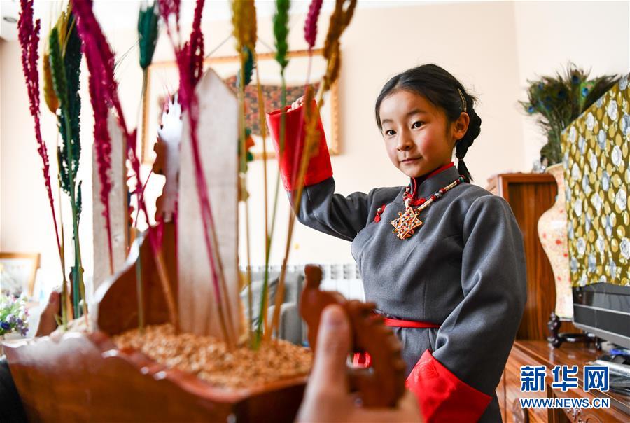一名身著藏裝的藏族小姑娘在吃切瑪(2月24日攝)。當日是藏歷新年初一,西藏各地群眾歡度藏歷新年。受新冠肺炎疫情影響,當?shù)靥岢娫挵菽辍⑸俪鲩T、不聚集,居家享受新年樂趣。新華社記者晉美多吉攝