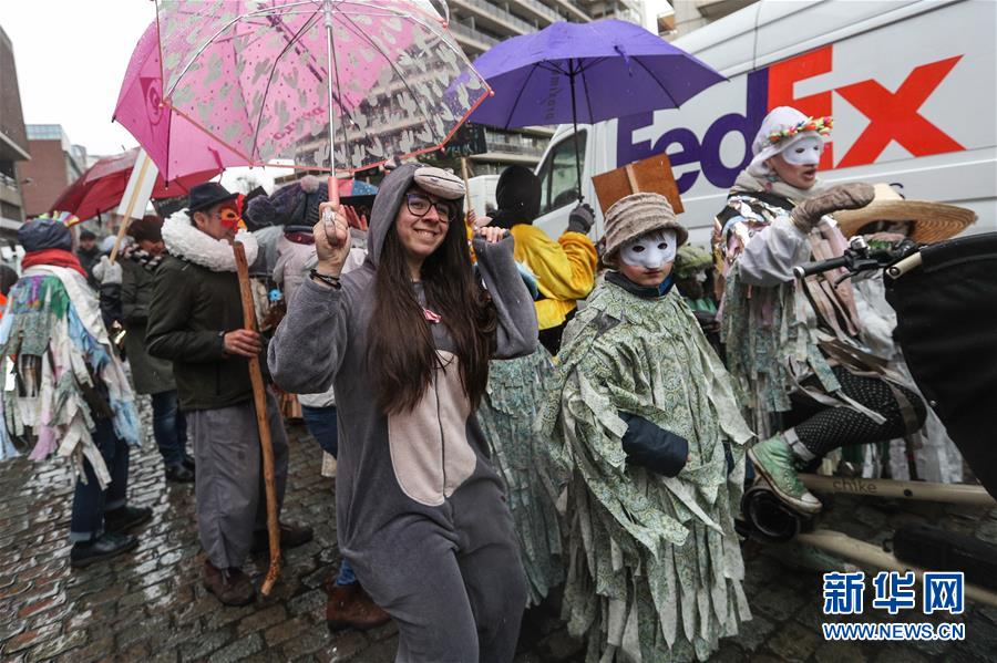2月27日,人們?cè)诒壤麜r(shí)布魯塞爾參加狂歡節(jié)活動(dòng)。  新華社記者鄭煥松攝