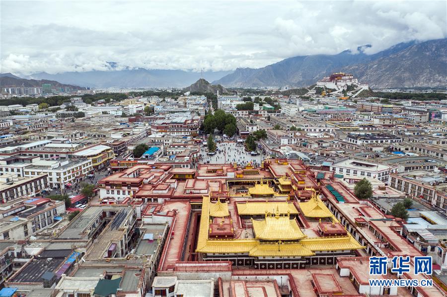 8月10日無(wú)人機(jī)拍攝的大昭寺和布達(dá)拉宮。新華社記者王建華攝
