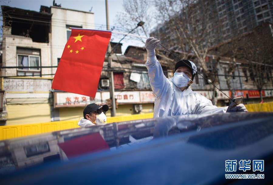 2月29日,W大武漢緊急救援隊(duì)隊(duì)長(zhǎng)王紫懿(右)將國(guó)旗插在車(chē)上。 新華社記者 肖藝九 攝