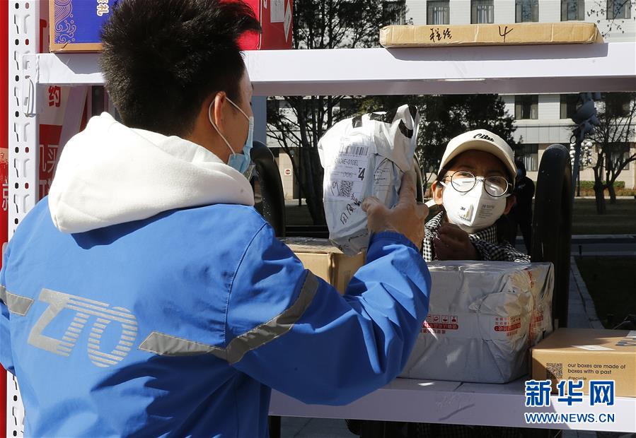 3月12日,李杰(左一)在中國青年政治學(xué)院快遞點(diǎn)隔著柵欄給客戶遞送包裹。新華社記者張玉薇攝