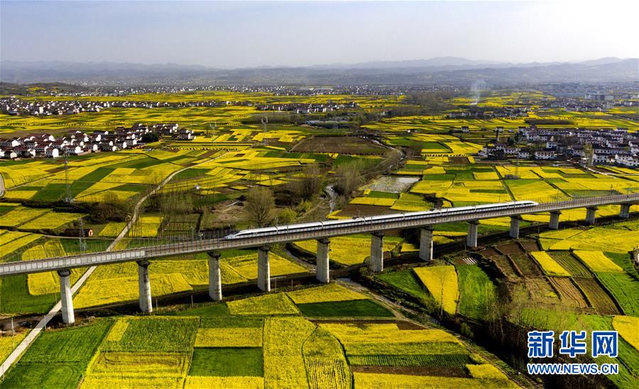 3月14日,一列動(dòng)車從洋縣油菜花海中駛過(guò)(無(wú)人機(jī)照片)。近日,秦嶺南麓的陜西省漢中市洋縣14萬(wàn)畝油菜花競(jìng)相開(kāi)放,美景如畫(huà)。新華社記者陶明攝
