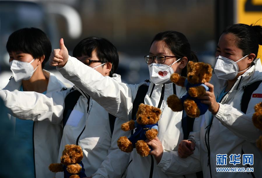 3月17日,醫(yī)療隊(duì)隊(duì)員乘坐大巴車離開天津?yàn)I海國(guó)際機(jī)場(chǎng)。新華社記者李然攝