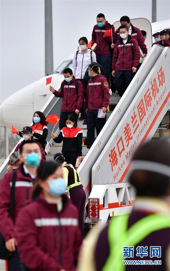 3月17日,醫(yī)療隊隊員抵達海南??诿捞m國際機場。新華社記者郭程攝