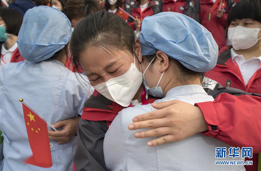 3月21日,武漢市第一醫(yī)院的桂欣(右)與天津市醫(yī)療隊(duì)隊(duì)員王勃昆擁抱道別。新華社記者費(fèi)茂華攝