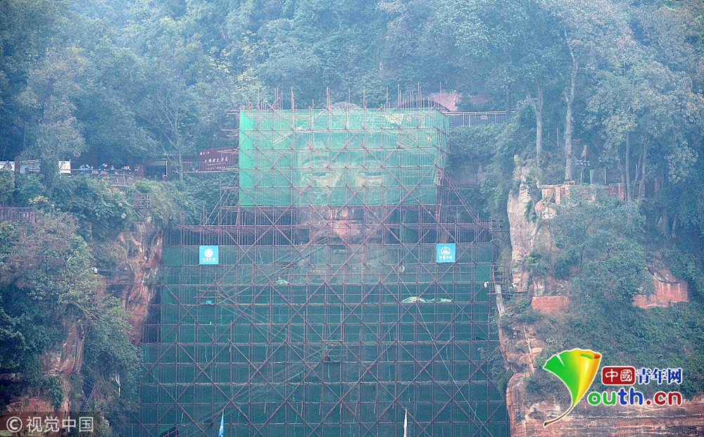 12月13日,四川樂山大佛周圍搭建腳手架已經到達大佛頭部,10多名工人穿梭于搭建的腳手架之間,工人用綠色防護網繞腳手架將大佛圍住。從2018年10月8日截至今日,經過66天的緊張施工,用了近兩千根6米長鋼管搭建腳手架,搭建的腳手架總重量達45噸,鋼管的總長度加起來達到11700米,而圍在腳手架外的防護網則使用了2000平方米左右。目前,包括頭部在內的樂山大佛本體已被全部遮蔽。