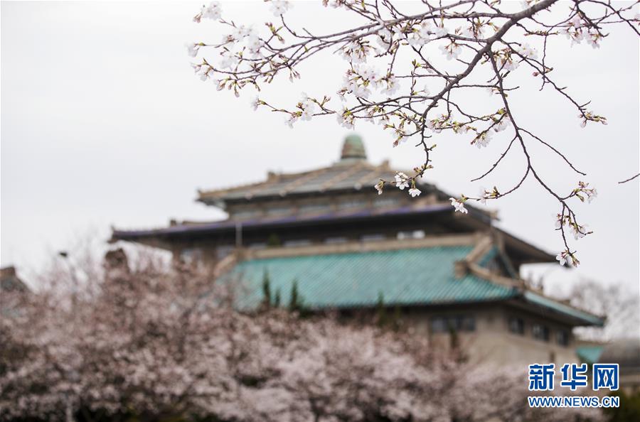 近日,隨著氣溫上升,武漢大學(xué)圖書館附近一片櫻花開放。新華社記者費(fèi)茂華攝