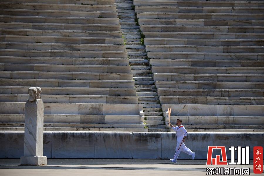 3月19日,希臘藝術(shù)體操運(yùn)動(dòng)員埃萊夫塞里奧斯·彼得羅尼亞斯手持圣火火炬跑入體育場(chǎng)。