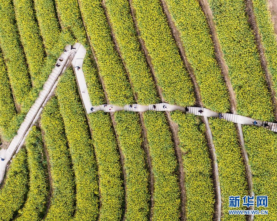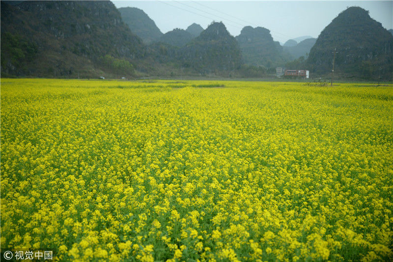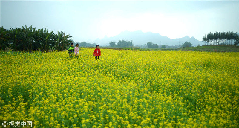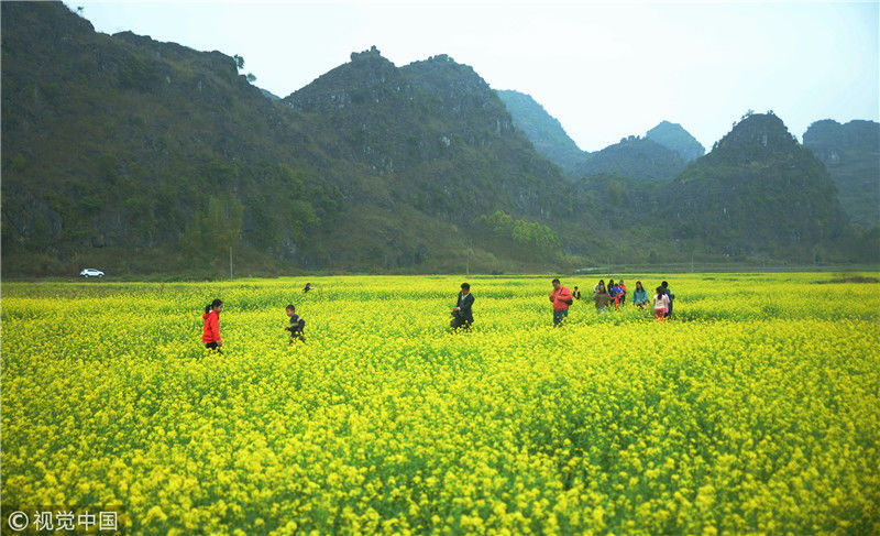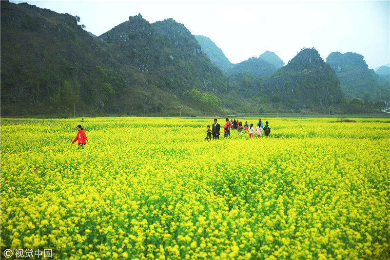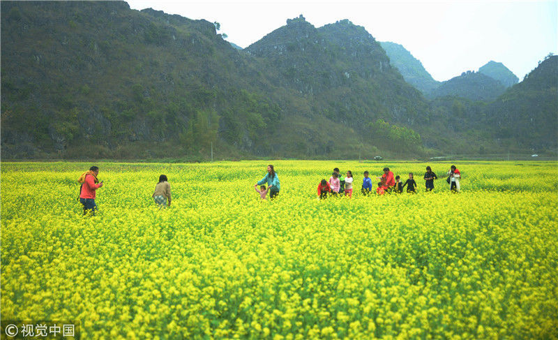 2019年2月5日,春節(jié)期間,廣西來賓市忻城縣萬余畝油菜花競相綻放,吸引眾多游客前來賞花游玩,感受春天的氣息。近年來,廣西忻城縣大力實(shí)施鄉(xiāng)村振興戰(zhàn)略,注重發(fā)展鄉(xiāng)村旅游產(chǎn)業(yè),把鄉(xiāng)村旅游與美麗鄉(xiāng)村、脫貧攻堅緊密結(jié)合起來,輻射帶動當(dāng)?shù)刎毨裘撠氈赂?。樊紹光/視覺中國