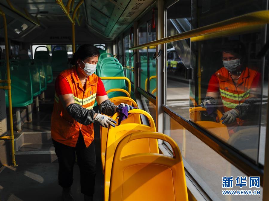 3月23日,在武昌火車站公交車總站,武漢公交集團站務(wù)公司保潔員趙真香在為一輛公共汽車消毒清洗。新華社記者肖藝九攝