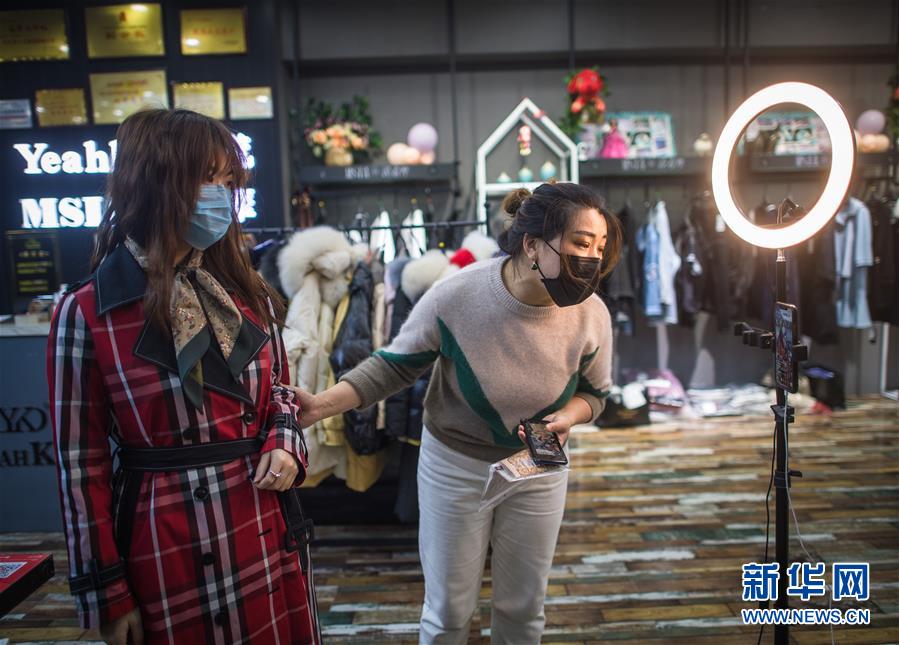 3月29日,在漢口北市場(chǎng),主播在直播平臺(tái)直播銷售一款服裝。新華社記者肖藝九攝