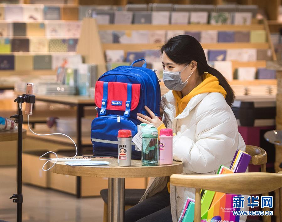 3月29日,在漢口北市場,一名主播在直播平臺直播銷售一款書包。新華社記者肖藝九攝