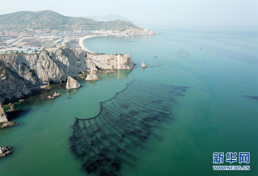 這是大欽島鄉(xiāng)附近海域的海帶養(yǎng)殖區(qū)(5月23日無人機拍攝)。新華社記者朱崢攝