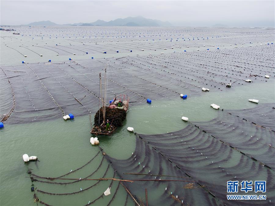 4月10日,霞浦縣長春鎮(zhèn)海域,海帶養(yǎng)殖戶在用船只運輸海帶(無人機拍攝)。新華社記者姜克紅攝