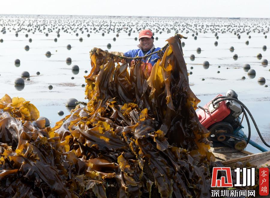 2020年3月29日,山東威海,榮成市愛連灣海水養(yǎng)殖區(qū)域,養(yǎng)殖工人開始收割海帶。