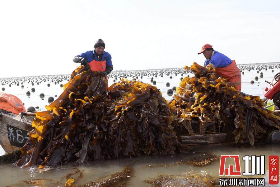 2020年3月29日,山東威海,榮成市愛(ài)連灣海水養(yǎng)殖區(qū)域,養(yǎng)殖工人開始收割海帶。