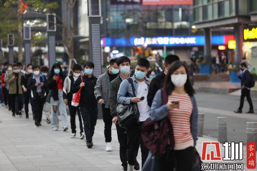 見圳客戶端·深圳新聞網(wǎng)2020年3月19日訊 下班時(shí)間,深圳地鐵一號線深大站A3出口外,下班后的市民在站外排大排長龍,依次有序進(jìn)入地鐵站乘坐列車回家。