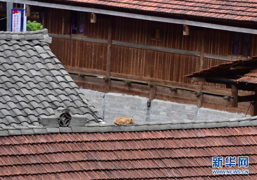 烏英苗寨的一只貓?jiān)谖蓓斔X(9月2日攝)。新華社記者黃孝邦攝