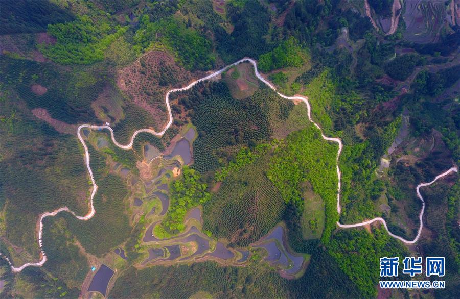 這是融水苗族自治縣桿洞鄉(xiāng)黨鳩村烏英苗寨的公路(4月18日無人機(jī)拍攝)。新華社記者黃孝邦攝