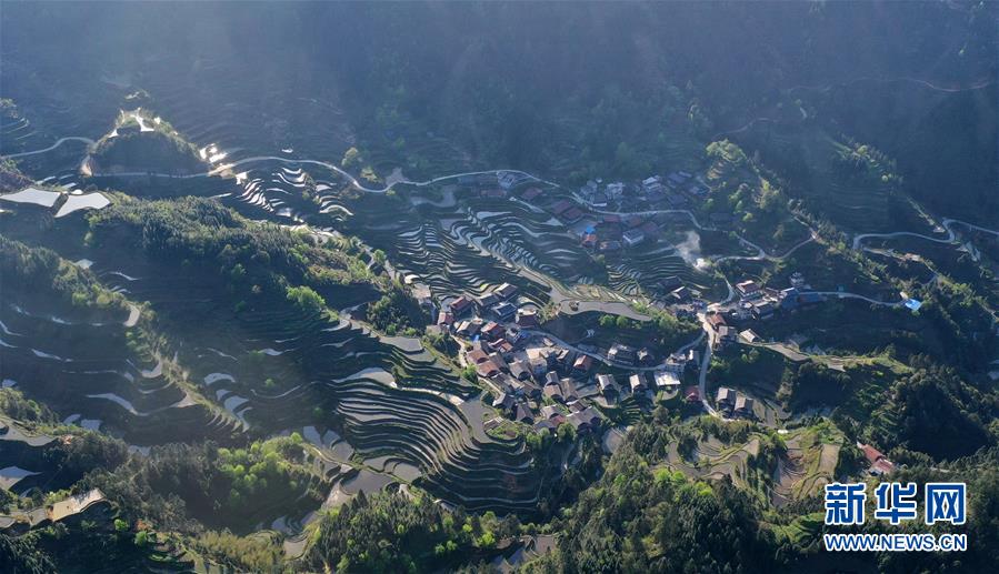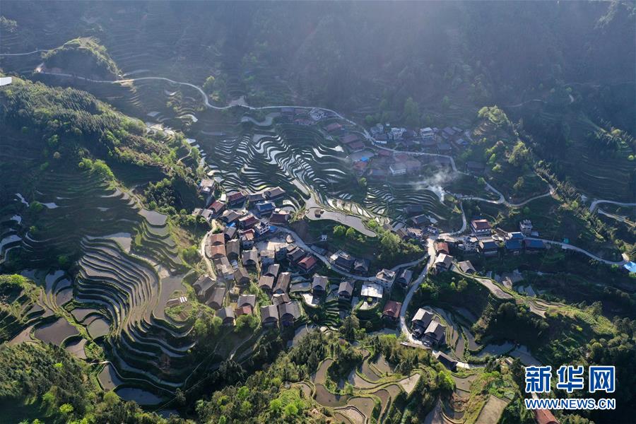 這是融水苗族自治縣桿洞鄉(xiāng)小河村高羽苗寨的木樓和梯田(3月31日攝,無人機(jī)照片)。新華社記者黃孝邦攝