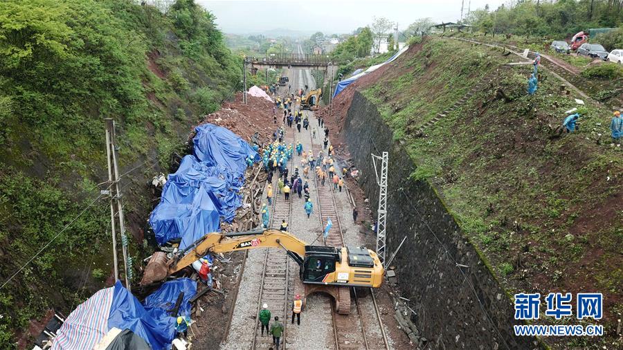 3月31日,工程車輛在T179次客運列車脫軌現(xiàn)場作業(yè)(無人機(jī)照片)。新華社發(fā)(陳振海攝)