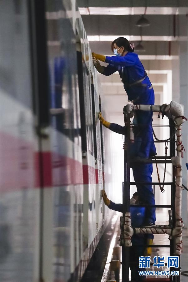 3月23日,在武漢地鐵常青車(chē)輛段,保潔人員清洗地鐵列車(chē)。新華社記者沈伯韓攝
