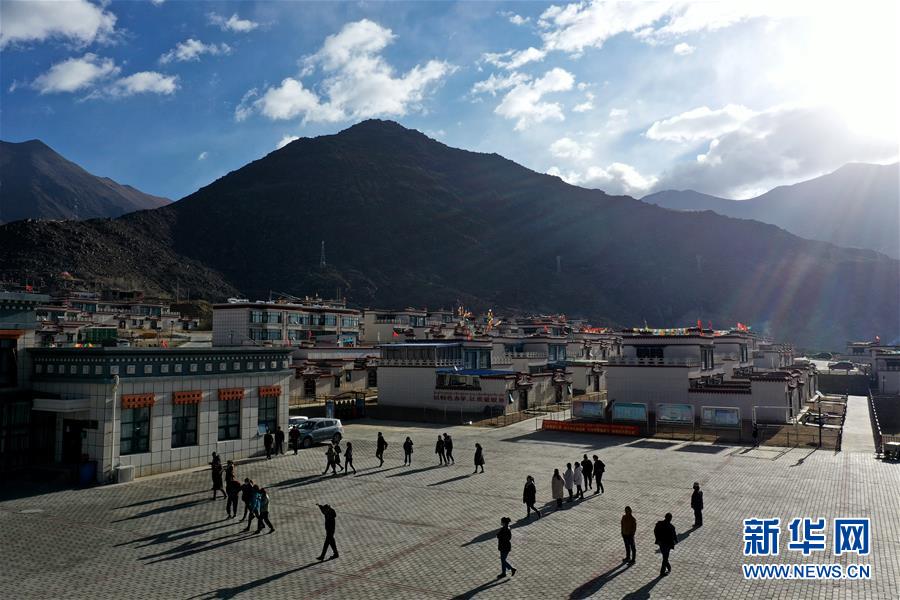 居民走在拉薩市堆龍德慶區(qū)古榮鄉(xiāng)榮瑪高海拔生態(tài)搬遷點廣場上(4月2日攝,無人機照片)。新華社記者 詹彥 攝